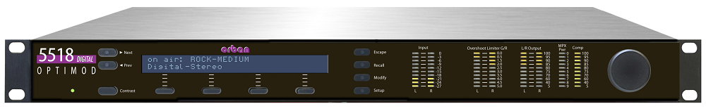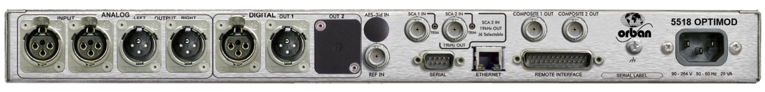 A stand-alone stereo encoder offering a dual-mode composite limiter (Orban’s patented “Half-Cosine Interpolation composite limiter or a hard clipper with overshoot compensation and band-limiting to 55kHz), and ITU-R 412 multiplex power controller, a left/right domain overshoot limiter (ideal for compressed links), an adjustable phase-linear lowpass filter, and a 64 kHz base sample rate. Pre-emphasis 50µs or 75µs. Inputs: AES3 digital and electronically balanced stereo analog (XLR). Sample rates automatically selected for AES/EBU input: 32, 44.1, 48, 88.1, and 96 kHz. Two SCA inputs (BNC) with adjustable sensitivity. 10 MHz reference input allows the pilot tone and output sample frequency to be locked to a high-precision reference like GPS. Output sample rates selected in software: 32, 44.1, 48, 88.1, and 96 kHz. Outputs: Two stereo encoder composite outputs (BNC). Remote control interface (DB25), RS-232 interface (DB9), 100 Mb/sec Ethernet interface (RJ45). Included PC Remote software runs on Windows® XP, Vista and 7/8. 1RU. 10 lbs/4.6kg.
