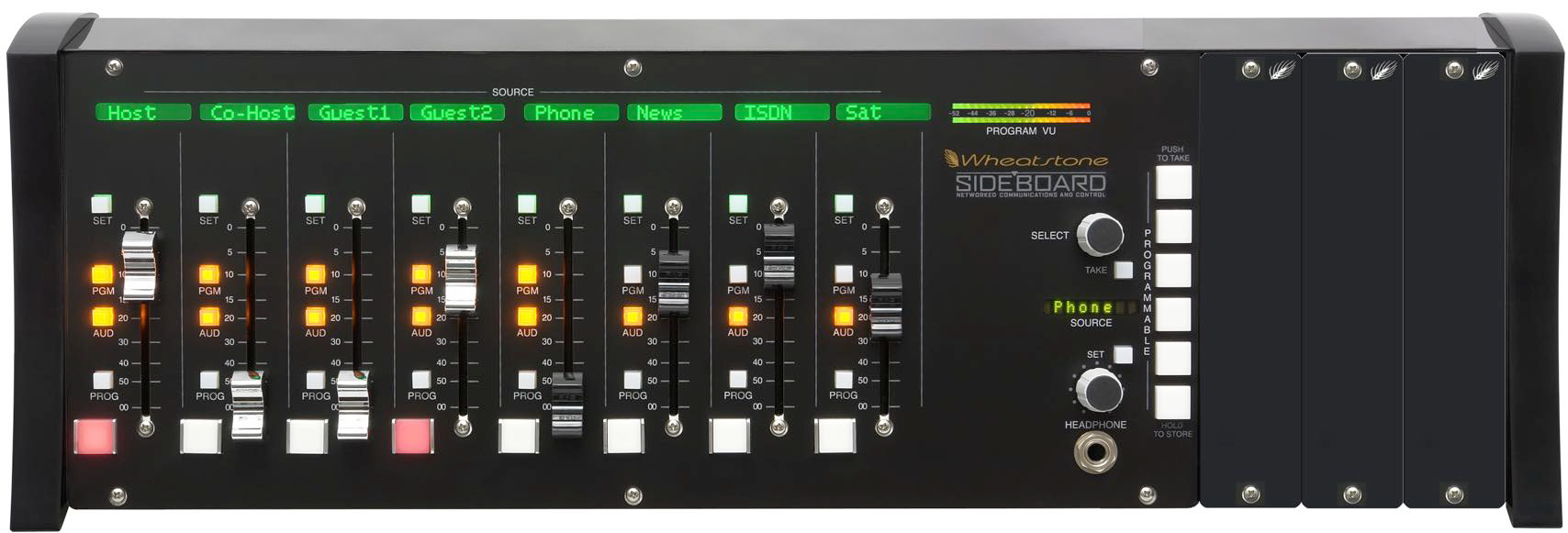 Each WheatNet-IP Blade has a built-in 8-channel UTILITY MIXER function. The SideBoard allows access to four or eight of those channels, using it wherever a small, purpose-driven mixer is needed. Its input faders can each access any source in a networked BLADE system and its PGM and AUD outputs appear as new sources in the audio network. Each Sideboard fader channel has an ON/OFF switch, PGM and AUD output assign buttons, a programmable (Prog) button that can be used for source preset, talkback, etc, and a Set switch for accessing the central source selection roatary control. Each fader has its own 8-character input source display. The stereo PGM OUTPUT is metered with dual 20-segment LED bargraphs. The monitor section has a headphone output with level control, and six programmable monitor source hot buttons for instant selection. There is also a source encoder knob with a TAKE switch and an associated display