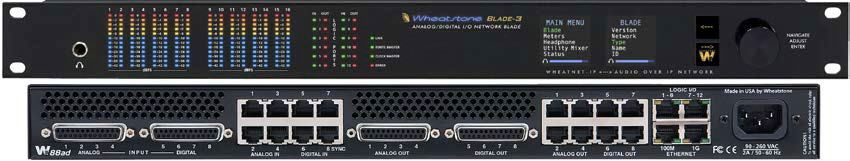 Standalone Input/Output router with 4 stereo analog inputs (8 mono), 4 AES-3 digital inputs and 4 stereo analog outputs (8 mono), 4 AES-3 digital outputs. Interface via DB-25 or RJ-45 connections. 12 assignalbe GPIO logic ports. Web Browser configuration interface. Network multiple I/O Blades through gigabit Ethernet switch.