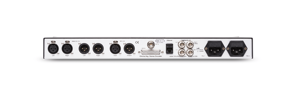 • Two composite inputs, two composite outputs. A “hot” backup processor can be looped through the Omnia.9sg and be automatically and immediately placed on air should the 9sg fail or lose power; also makes it possible to use an external RDS encoder if desired.