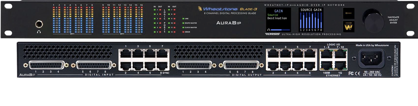 Aura8ip Processing I/O Blade. Eight stereo processing channels that can be assigned to internal I/O or assigned within the WheatNet-IP audio network. Each Aura8ip also has 8 analog line, 4 AES inputs x 8 analog line, 4 AES outputs. Internal audio clip player. Exclusive and fully adjustable three band Vorsis Dynamics Controller. One, Two, or Three Band processing per channel with adjustable crossovers. Limiter can be 'Look Ahead' or not. Four-Band Equalizer with two parametric bands and high and low shelving bands. Tunable High pass / Low pass Filters. Voice phase scrambler. Bass Enhancement. Stereo Enhancement. Equalizer may be pre or post Dynamics Controller. Simultaneous Analog and Digital Outputs. Electronically balanced line level analog outputs. Front panel metering: Inputs & Outputs. 48 kHz output sample rate. Remote Control of all audio parameters. Local or remote control via intuitive PC-based Graphical User Interface (GUI). Multilevel password protection. Preset storage and recall for up to 100 presets. TCP/IP Ethernet remote control. Four AES Inputs and Outputs and 4 Stereo Analog Inputs and Outputs. High quality 24-bit A/D and D/A converters. Aura8ip can operate standalone or as part of a WheatNet-IP audio network.
