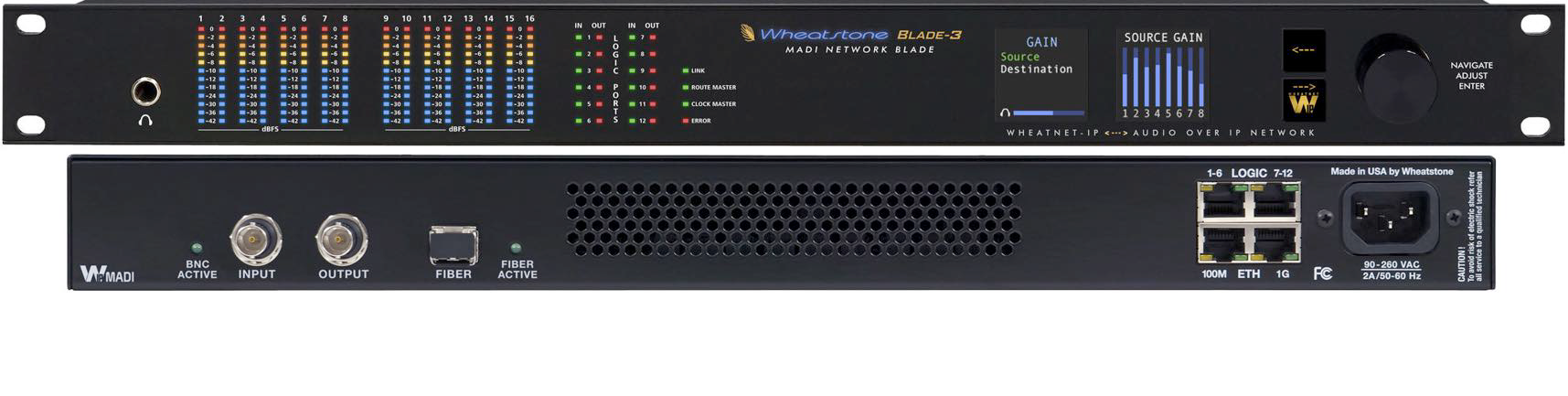 Interface the WheatNet-IP audio network with any MADI device. Provides 64 inputs and outputs on BNC or Fiber. Alsoincludes 12 assignable GPIO logic ports.